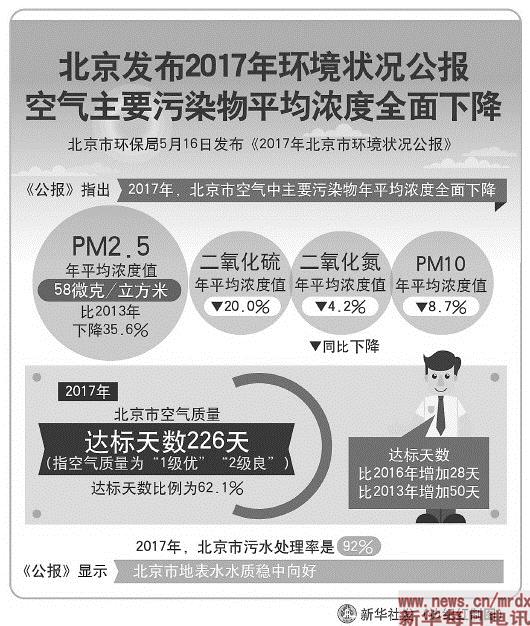 新华社北京5月16日电(记者倪元锦)北京市环保局16日发布《2017年北京市环境状况公报》称,通过5年的治理,空气质量实现持续改善,完成国家“大气十条”目标任务。2017年,污水处理率达到92%,劣Ⅴ类水质比例下降,土壤环境质量国控监测点位达标率为94.6%,声环境质量保持稳定,辐射环境质量保持正常,生态环境状况良好。 《公报》指出,2017年,北京市空气中主要污染物年平均浓度全面下降,PM2.5年平均浓度值为58微克/立方米,比2013年下降35.6%;二氧化硫、二氧化氮、PM10年平均浓度值分别为8微克/立方米、46微克/立方米、84微克/立方米,同比分别下降20.0%、4.2%、8.7%。