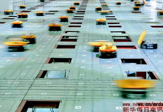 在义乌申通公司,机器人运载包裹进行分拣(2017年5月3日摄)。新华社记者张铖摄 |