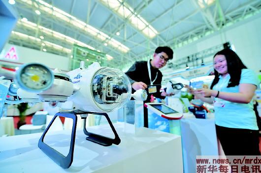 5月17日,观众在天津梅江会展中心智能科技展上参观深之蓝的水下机器人。新华社记者李然摄