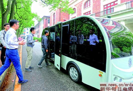 5月8日,乘客登上在上海交通大学校园内进行实验性运行的无人驾驶小巴。新华社记者刘颖摄 |