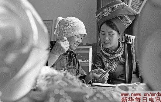 ▲在广西靖西市新靖镇旧州街,黄肖琴老人(左)在教邻居赵爱培做绣球(5月15日摄)。近年来,广西靖西市大力发展壮锦、绣球、绣花等手工艺产业,众多心灵手巧的妇女依靠“一针一线”就可以实现在家门口就业。