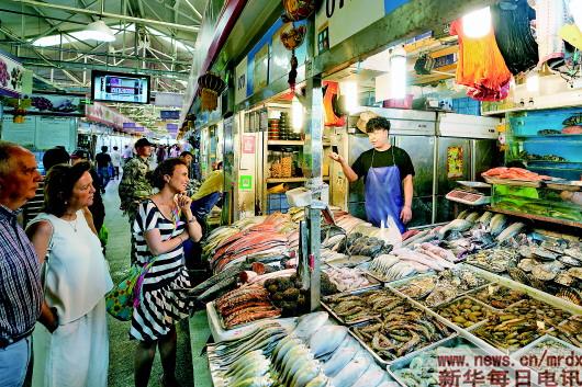 5月8日,在三源里市场72号商铺,外国顾客在选购海鲜产品。本报记者鞠焕宗摄