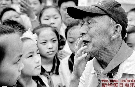 | ▲5月19日,周火生老人(前右)与金寨县希望小学的孩子们在一起交谈。当日,80多岁的周火生再次来到大别山腹地的安徽省金寨县南溪镇,开始了他的第100次金寨助学之旅。新华社记者陶明摄