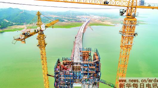 5月21日,工人在鄱阳湖二桥北主塔顶部施工,将于6月初封顶。鄱阳湖二桥是江西都昌至九江高速公路的控制性工程。