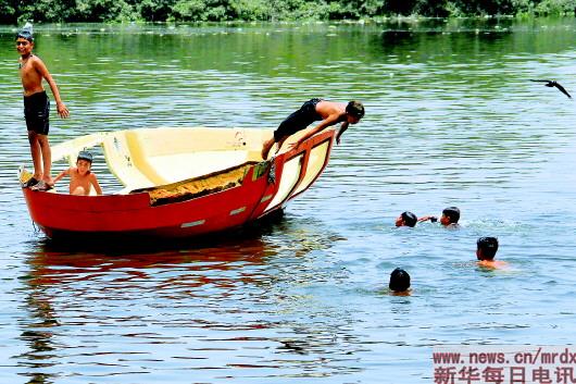 5月22日,在巴基斯坦卡拉奇,男孩们跳进水中消暑。近日,巴基斯坦南部城市卡拉奇连遇高温天气,最高气温达44摄氏度,已造成至少65人死亡。