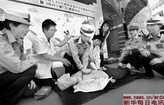 5月24日,上海市公安局徐汇分局交警支队民警在医生的指导下进行心肺复苏练习。当日,由上海市公安局徐汇分局交警支队联合徐汇区卫计委共同组成的“警医合作”文明交通宣讲团在上海成立。宣讲团成员经培训后将深入到辖区内社区、学校以及各企事业单位,在传播卫生健康知识的同时,传递交通安全理念。