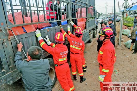 5月28日,救援人员在毛都站镇牙木吐村搬运救援物资。新华社记者张楠摄