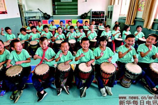 ▲近日,阳曲县首邑学校的学生在课堂上学习打非洲鼓。