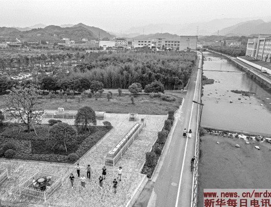 ▲5月29日,空中俯瞰高虹镇经过整治的景观河仇溪(无人机拍摄)。浙江省杭州市临安区高虹镇以光电产业而闻名,近两年,高虹镇积极推进节能灯产业转型升级,淘汰落后产能。同时当地政府还通过“三改一拆”“五水共治”等多项举措积极推进小城镇环境综合整治,让早年因产业发展、人口激增而变成垃圾河的仇溪变得干净;另外投入专项资金清理河道边的违章建筑、修建慢步道、恢复沿河绿化、设计建造滨水休闲公园等,让昔日的垃圾河变身美丽乡村的景观河。