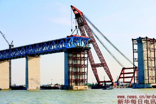 6月1日,由中铁大桥局施工的沪通长江大桥首个超千吨大节段钢梁架设成功。