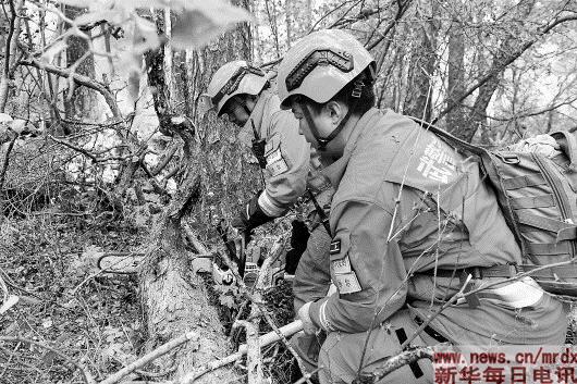 ▲6月4日,武警森林部队官兵在汗马国家级自然保护区锯断燃烧的树木。