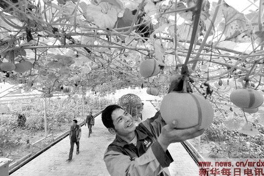 6月6日,上饶县董团乡联合村建档立卡贫困户谢春生在江西盛水实业集团公司果蔬生产大棚内护理观赏南瓜。谢春生家有5亩多地,全部流转给该公司,并常年在公司务工,年收入3.3万余元,2017年全家实现脱贫。