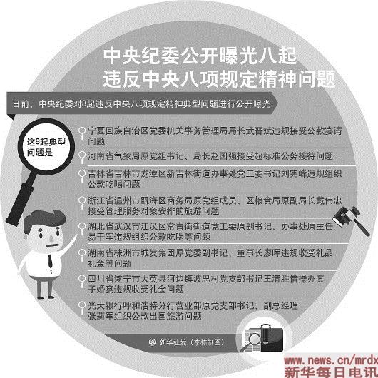 中央纪委有关负责人强调,上述8起问题中,有的变换手法,把餐桌摆到内部食堂当幌子,掩盖公款吃喝的事实;有的坦然接受管理服务对象的宴请、礼金和旅游安排,既违反了廉洁纪律,又破坏了“亲”“清”的政商关系;有的借喜庆事宜收金敛财,甚至向贫困户、低保户伸手,陈规陋俗屡禁不改;有的组织公款出国旅游,慷公家之慨;有的单位一把手带头违纪,带坏了单位风气。这些受到处理的党员干部,教训极为深刻,广大党员干部必须引以为戒,时刻反躬自省。