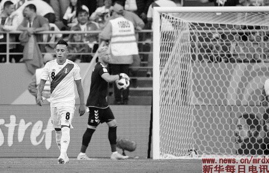 ▲6月16日,秘鲁队球员奎瓦(左)在错失点球破门良机后神情沮丧。