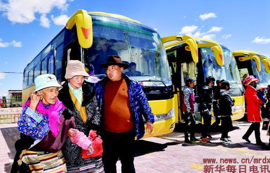 81岁的牧民石秀拉姆(左一)是迁出群众中最年长的一位,她将在拉萨的新家安度晚年(6月18日摄)。