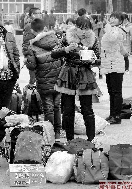 2015年春运期间,一位旅客在郑州火车站广场吃方便面。