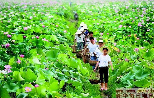 莲农从丰收的莲田间走过(7月14日摄)。目前,江西省抚州市广昌县11万余亩白莲进入丰收采摘期,莲田里一派繁忙景象。