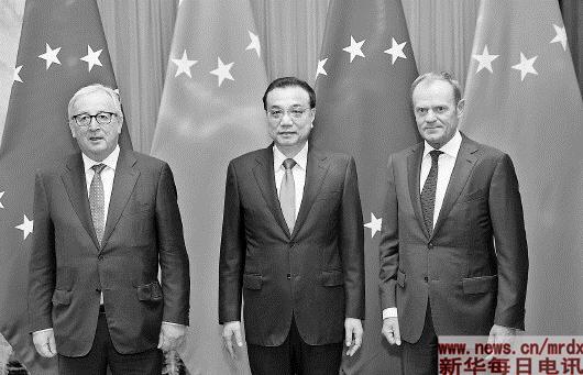 ▲7月16日,国务院总理李克强在北京人民大会堂同欧洲理事会主席图斯克、欧盟委员会主席容克共同主持第二十次中国欧盟领导人会晤。