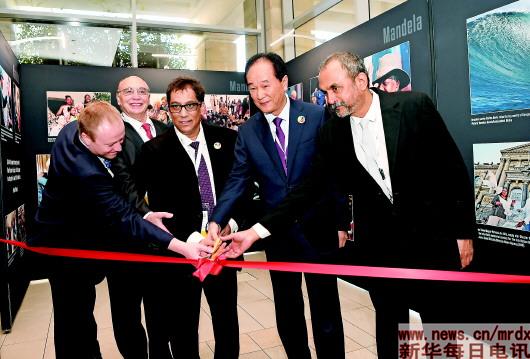 7月18日,在南非开普敦,金砖国家媒体主席团成员为联合摄影展开幕剪彩。