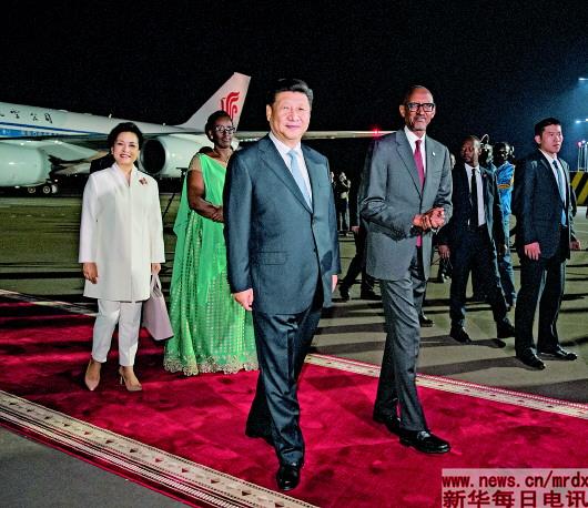 习近平是在结束对塞内加尔国事访问后抵达基加利的。离开达喀尔时,习近平出席塞内加尔总统萨勒在机场举行的欢送仪式。习近平和彭丽媛抵达机场时,萨勒和夫人玛丽梅在停车处迎接。两国元首夫妇一同前往停机坪。两国元首登上检阅台。军乐队奏中塞两国国歌。习近平在萨勒陪同下检阅仪仗队。习近平和彭丽媛同塞方送行人员道别。萨勒夫妇同中方陪同人员道别。