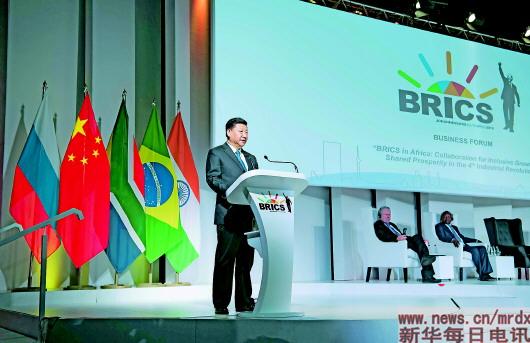▲7月25日,国家主席习近平应邀出席在南非约翰内斯堡举行的金砖国家工商论坛,并发表题为《顺应时代潮流 实现共同发展》的重要讲话。新华社记者李涛摄