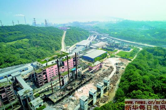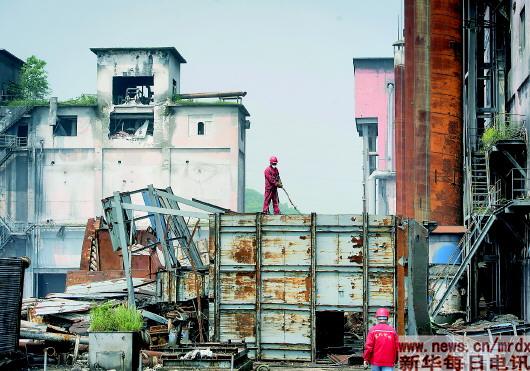 ▲工人在湖北香溪化工有限公司宜都分公司拆除现场作业(4月30日摄)。