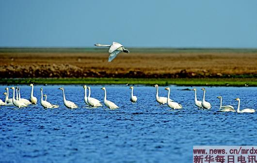 在东洞庭湖国家级自然保护区内拍摄到的小天鹅(2017年3月1日摄)。新华社记者李尕摄
