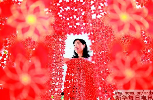▲8月13日,在山东省淄博市沂源县一刺绣企业,一名妇女在晾晒加工刺绣作品。