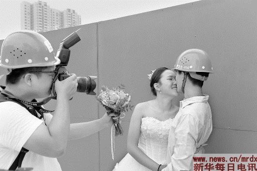 ▲8月15日,摄影师在为万家聪(中)和张桥钦拍摄婚纱照。当日,四对夫妇在位于长沙的中建二局某工地用拍摄婚纱照的形式迎接即将到来的七夕佳节。中建二局在此次活动中征集了长沙、衡阳等工地项目的夫妻,为他们组织拍摄婚纱照片,送上节日的祝福。