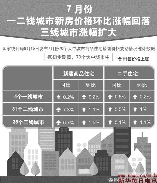 国家统计局城市司高级统计师刘建伟称,7月份,各地继续坚持因城施策,调控措施陆续加码,努力促进供求平衡。从环比看,4个一线城市新建商品住宅销售价格上涨0.2%,涨幅比上月回落0.4个百分点;31个二线城市上涨1.1%,涨幅比上月回落0.1个百分点;三线城市则略有扩大。