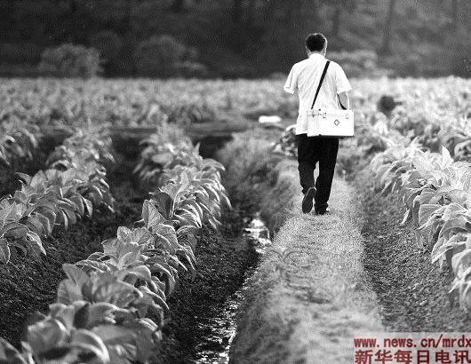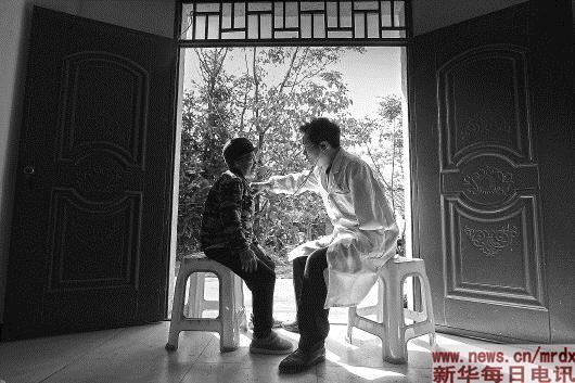 李彦在卫生站为村民检查身体(4月17日摄)。