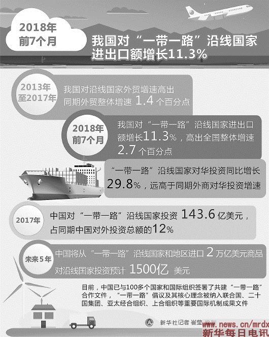 贸易正在成为中国与“一带一路”沿线国家深化合作的纽带。2013年至2017年,我国对沿线国家外贸增速高出同期外贸整体增速1.4个百分点。今年前7个月,我国对“一带一路”沿线国家进出口额增长11.3%,高出全国整体增速2.7个百分点。