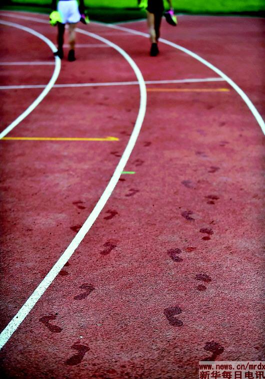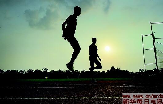 ▲江苏省残疾人体育训练中心田径场,一场训练结束后,陆文凯(右)和陆文旋已满头大汗。(8月16日摄) |