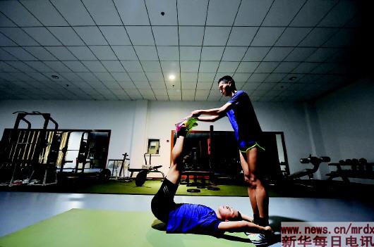 ▲晚上8点双胞胎兄弟在室内训练馆进行力量训练。(8月15日摄) |