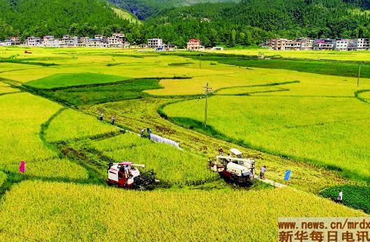 金秋时节,贵州省铜仁市松桃苗族自治县种植的水稻进入成熟期,当地农民抢抓时机收割稻谷,到处是一派繁忙的丰收景象。 新华社发(龙元彬摄)