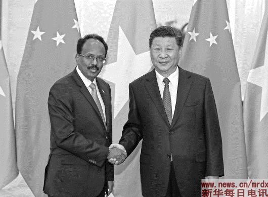 习近平强调,中索友谊源远流长。索马里是第一个同新中国建交的东部非洲国家,也是支持恢复中华人民共和国在联合国合法席位的提案国之一。中方祝贺索马里和平重建进程取得新进展,将一如既往支持索马里政府推进政治进程、促进社会和解、提升治理能力,支持索方维护主权、安全、领土完整的努力。双方要加强在“一带一路”倡议、中非合作论坛、中阿合作论坛框架内合作。