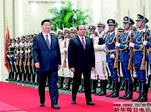 塞西表示,埃中保持着传统友谊和高度互信,在重大国际问题上立场相近,配合密切。埃方将埃中全面战略伙伴关系置于优先地位。埃及是最早支持“一带一路”倡议的国家之一,坚信这一倡议将为埃中双边和国际区域合作带来巨大机遇。埃及将继续支持和参与共建“一带一路”。作为非盟下任轮值主席国,埃及将继续推动非洲同中国的合作。非洲国家最需要的就是发展。中非合作论坛北京峰会的召开证明了中国对非洲发展的高度重视。埃方全力支持中方成功举办峰会。埃及积极评价中国在中东问题上秉持公正立场,愿加强同中国在多边领域的协作。