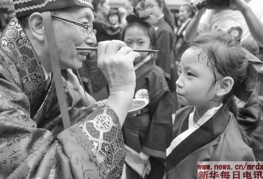 ▲9月1日,在福州市廉政文化示范点——船政衙门,司仪在传统“入泮拜师礼”上为学生点朱砂,象征启蒙开智。当日,福建省福州市举办形式多样的“开学第一课”,弘扬尊师明礼、爱国向善、崇廉明理的传统美德。新华社记者宋为伟摄