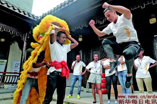 8月30日,安泰时装有限公司的埃塞俄比亚员工在德清县乾元镇国学图书馆跟中国老师学习舞狮。 2017年,浙江省湖州莫干山高新技术产业开发区的安泰时装有限公司在埃塞俄比亚开设了一家分公司。为了更好地建设企业团队,2018年3月起,共93名埃塞员工被安排分两批来到中国,进行为期6个月的生产技能学习。他们还利用业余时间学习汉语、书法、武术等中国文化。“我们在这里不仅跟着中国师傅学习技能,”28岁的埃塞小伙达哥说,“更重要的是学习中国思维,尤其是勤奋工作、守信守时这些优点。”新华社发(王正摄)