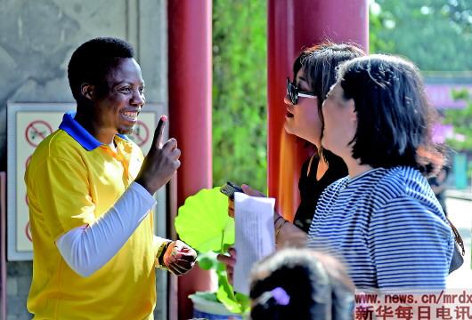 8月31日,来自卢旺达的志愿者常乐(左)在圆明园南门检票口与游客交流。 成立于2017年的圆明园志愿者招募站长期面向公众招募志愿者。今年7月,近20名非洲留学生加入到圆明园志愿服务的队伍中来,他们分别来自卢旺达、肯尼亚、马里等非洲国家和地区,目前是北京各高校的在读本科生或研究生,主要承担讲解、咨询、引导等志愿服务工作。新华社记者罗晓光摄