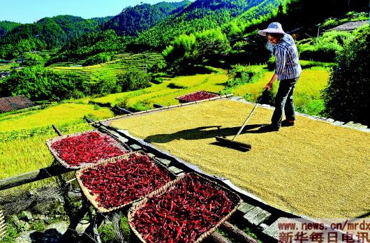 ▲9月20日,武夷山市吴屯乡后源村村民在晒稻谷。金秋时节,福建省武夷山市吴屯乡后源村千亩梯田稻浪滚滚,当地农民忙着收割、晒秋,一派丰收景象。  新华社记者张国俊摄