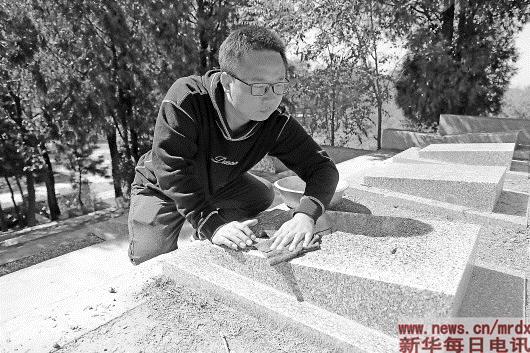 闫永杰在长城脚下的八达岭烈士陵园擦拭烈士墓碑(9月28日摄)。