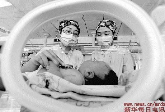 ▲10月4日,在河北省武安市第一人民医院新生儿科,医护人员为一名婴儿做检查。