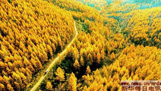 10月8日,一辆汽车行驶在好地方林场的林间道路上(无人机拍摄)。