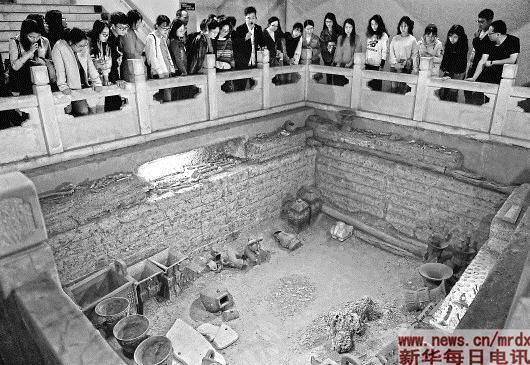 ▲游客在安阳殷墟宫殿宗庙遗址内的妇好墓参观(10月12日摄)。新华社记者李安摄