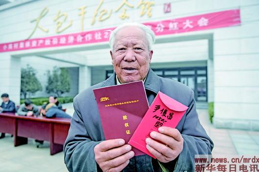 ▲在安徽小岗村大包干纪念馆门前,大包干带头人严俊昌领取了第一次集体经济收益股权分红(2月9日摄)。
