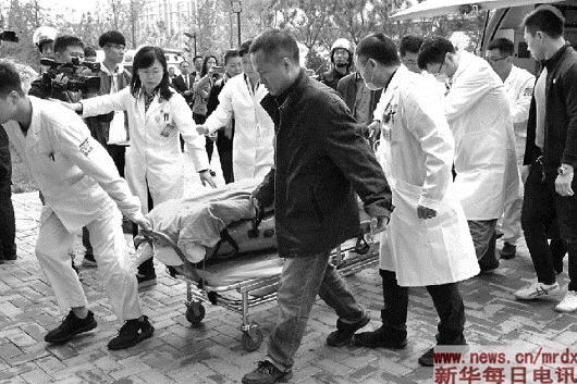 ▲北京天坛医院医生与999医务人员共同将病人抬下救护车。