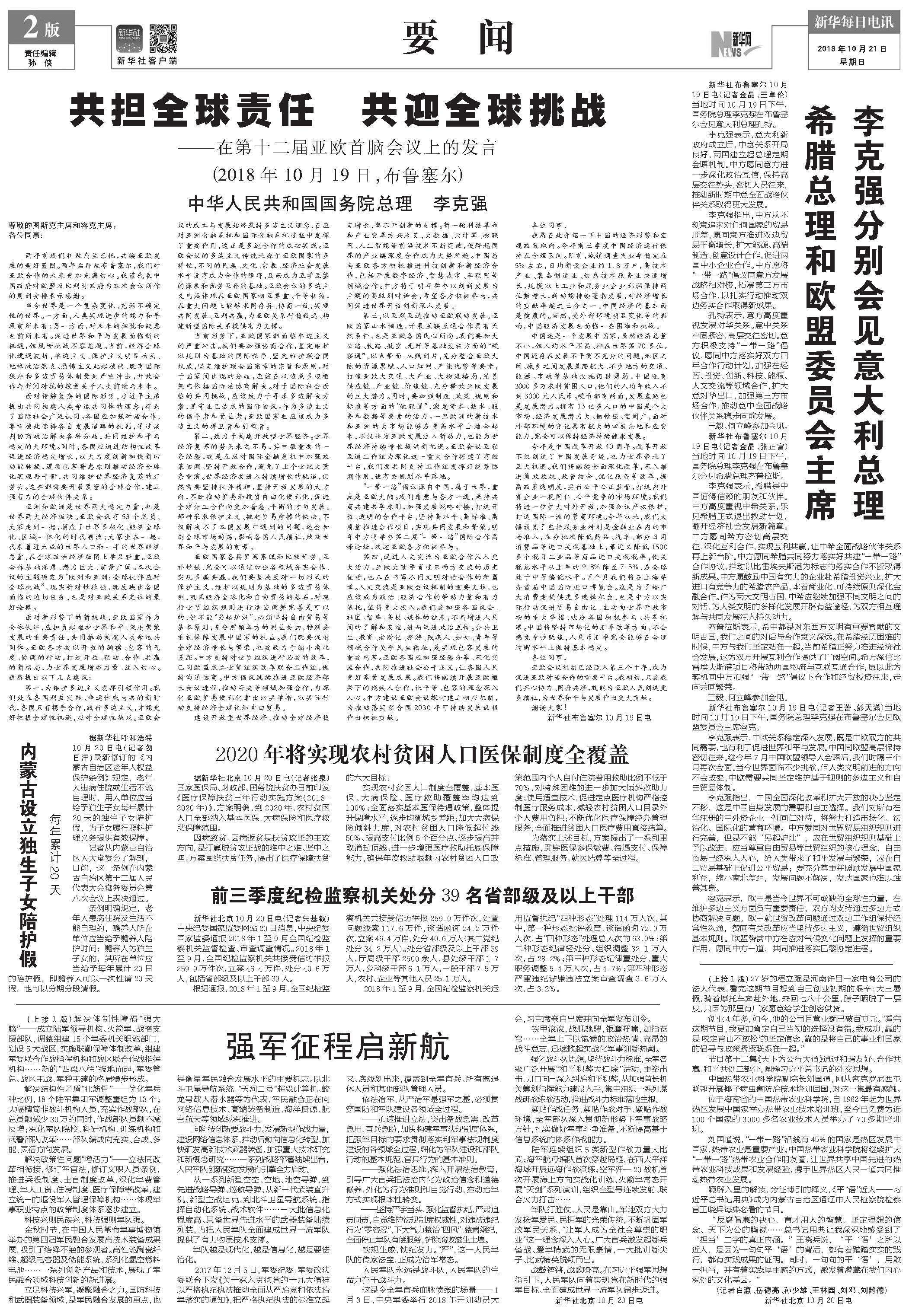 共担全球责任 共迎全球挑战——在第十二届亚欧首脑会议上的发言(2018年10月19日,布鲁塞尔)中华人民共和国国务院总理 李克强