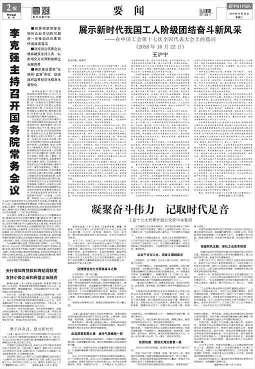 展示新时代我国工人阶级团结奋斗新风采——在中国工会第十七次全国代表大会上的致词(2018年10月22日)王沪宁