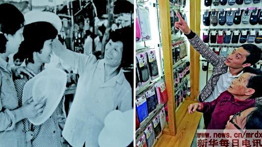 这是一张拼版照片,左图为:义乌小商品市场第一代经营户冯爱倩(右一)在向顾客推销遮阳帽的资料照片(新华社发);右图为:2018年10月25日,78岁的冯爱倩(中)在倾听她的孙子、义乌国际商贸城经营户杨帆(上)介绍他自产自销的新款袜子。杨帆大学毕业后当上了父亲创办的袜业公司的总经理(新华社记者谭进摄)。